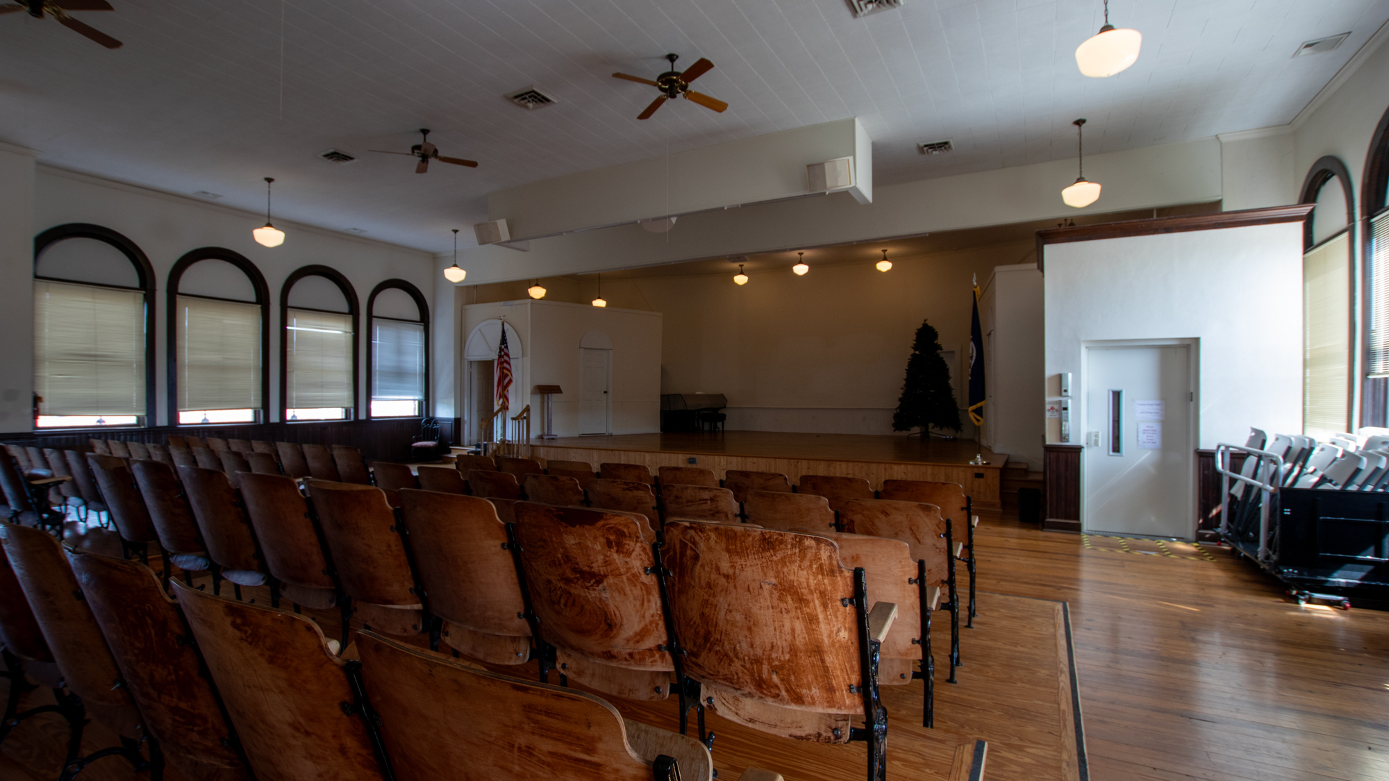 What used to be the courtroom is now the Baldwin Auditorium, named for Dan Baldwin, the man who bought the 1908 Courthouse to preserve it. It is the scene of many events such as concerts, plays, meetings, parties, receptions, and civic events. There is seating for 150 attendies.