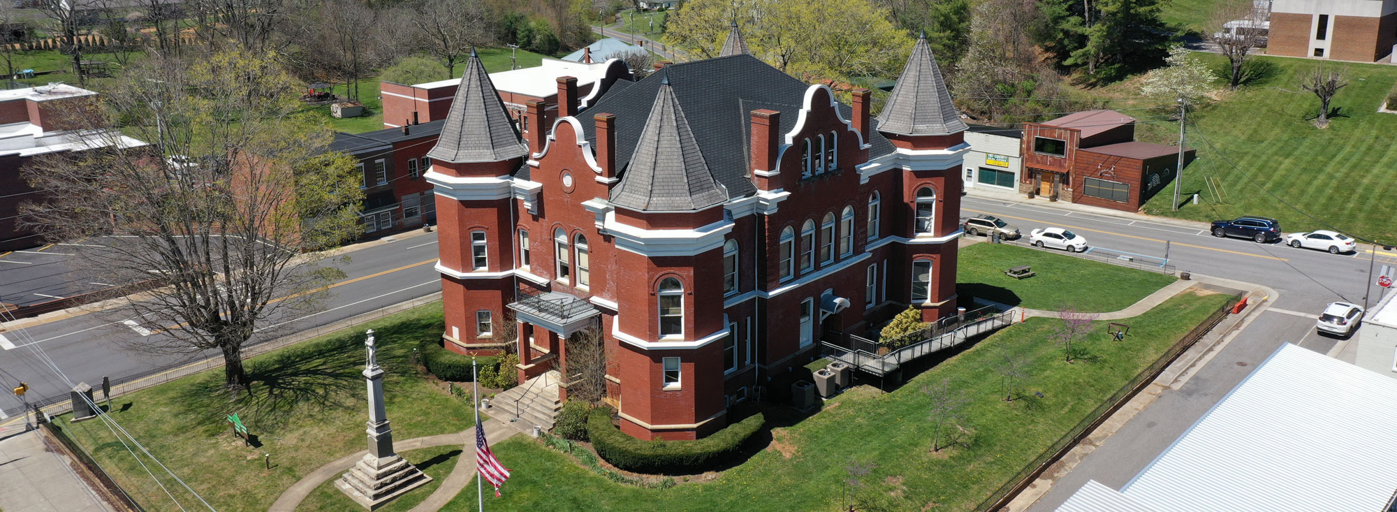 The Confederate Monument, “Parade Rest”, that stands in front of the courthouse was added later and dedicated in 1911. It is made of carrara marble from Italy and is resting on granite quarried from just north of Richmond and is similar to other county monuments throughout the south.